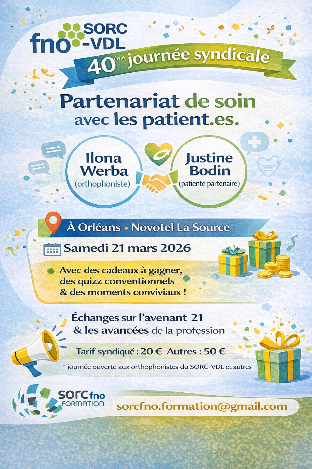 Le SORC Centre-Val de Loire organise sa 40ᵉ journée syndicale le samedi 21 mars 2026 à Orléans (Novotel La Source). Cette journée sera consacrée à un thème central dans l’évolution des pratiques en santé : le partenariat de soin avec les patient·es.