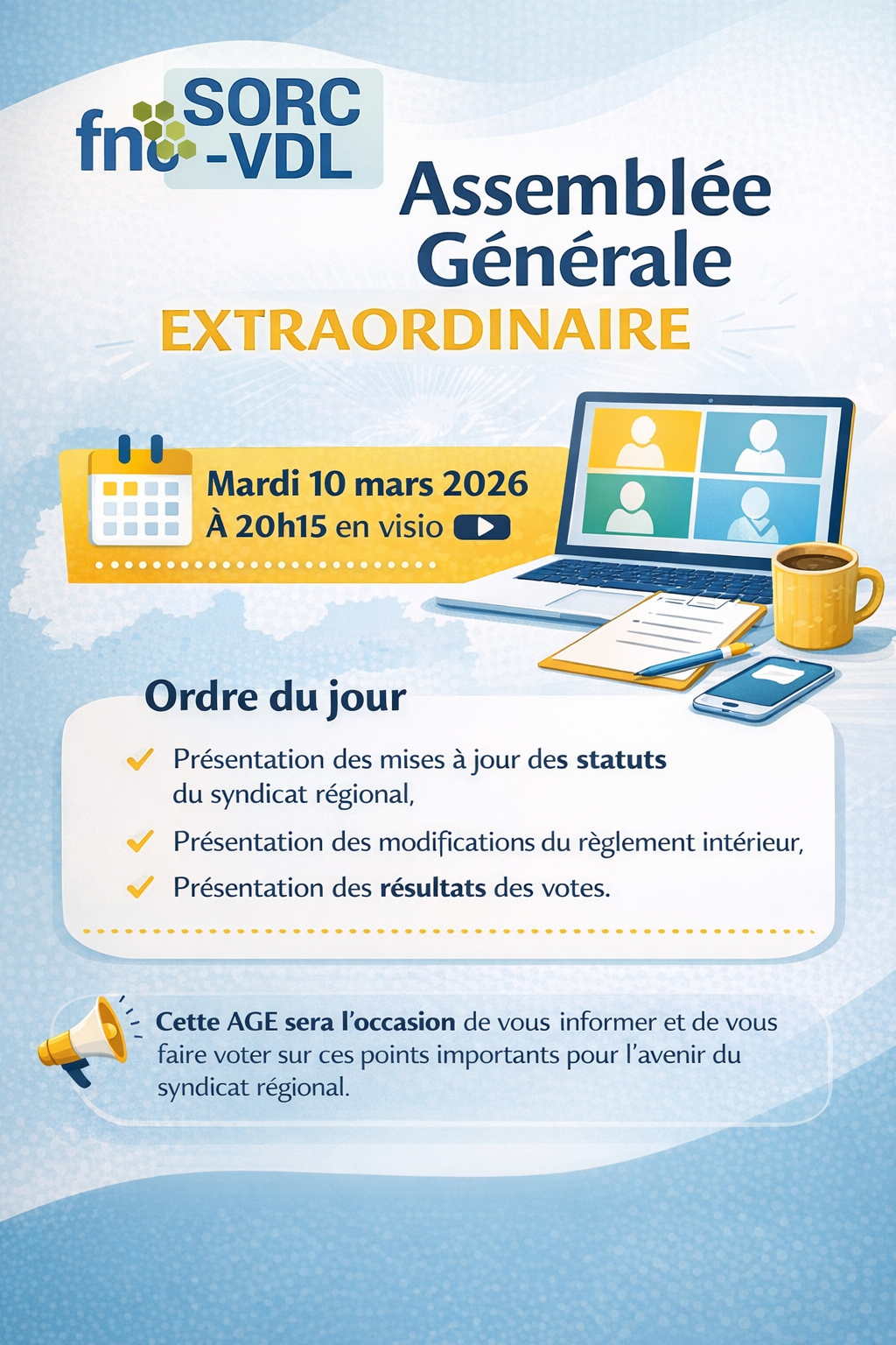 Nous avons le plaisir de vous convier à la prochaine Assemblée Générale Extraordinaire du SORC Centre-Val de Loire, qui se tiendra :