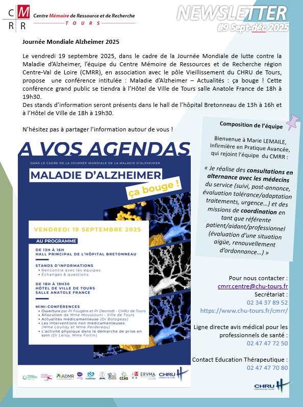 Veuillez trouver ci-joint notre nouvelle newsletter du dernier trimestre 2025 vous présentant le programme de la prochaine Journée Mondiale Alzheimer qui se tiendra le 19 septembre au CHU Bretonneau et à l’Hôtel de Ville de Tours pour des stands et une conférence grand public. Vous y trouverez également la présentation de notre nouvelle Infirmière en Pratique Avancée ayant récemment rejoint l’équipe.