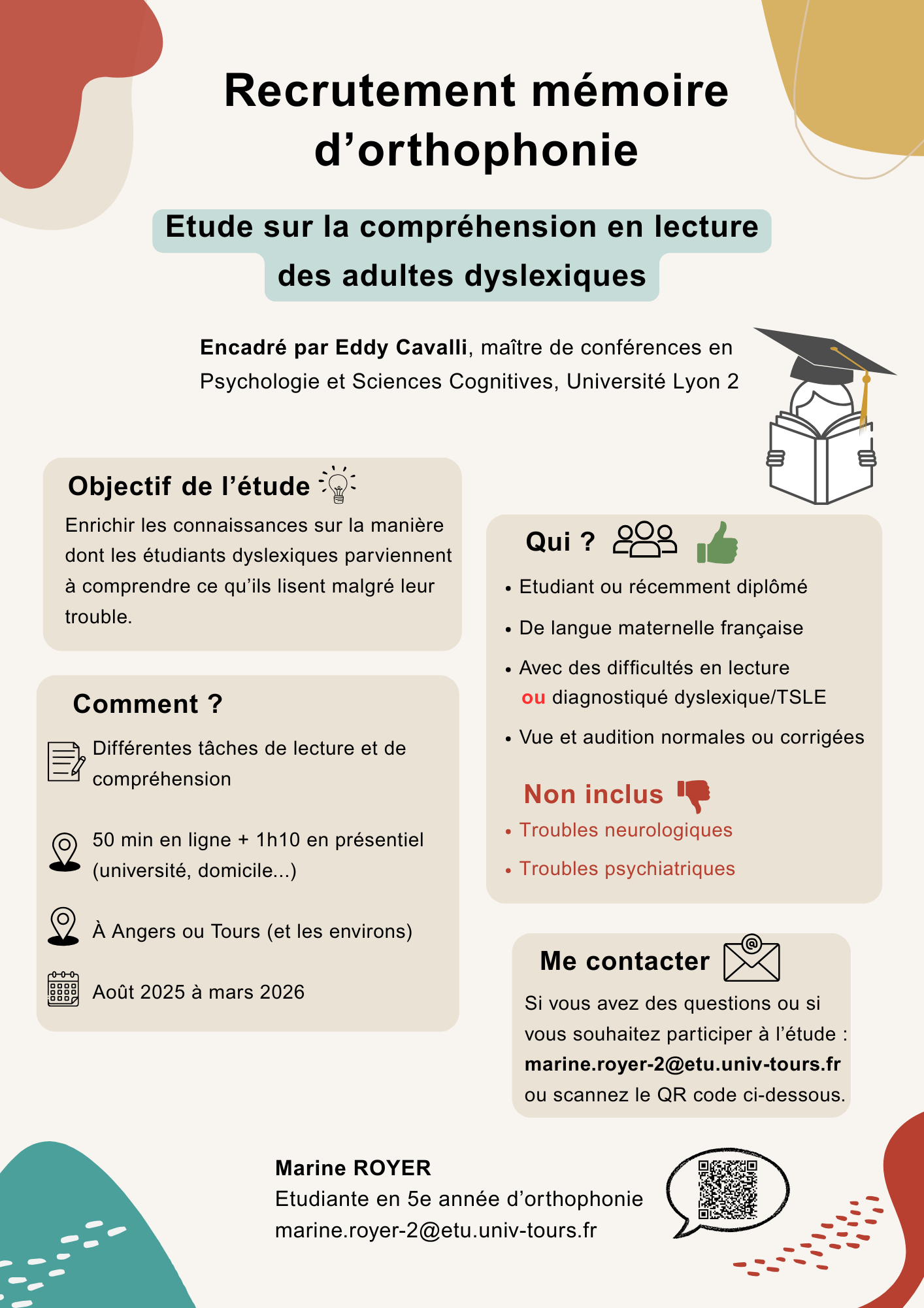 Dans le cadre de mon mémoire encadré par Eddy Cavalli, maître de conférences en Psychologie et Sciences Cognitives à l’Université Lyon 2, nous cherchons à mieux comprendre comment les étudiants dyslexiques parviennent à saisir le sens de leurs lectures malgré leurs difficultés.