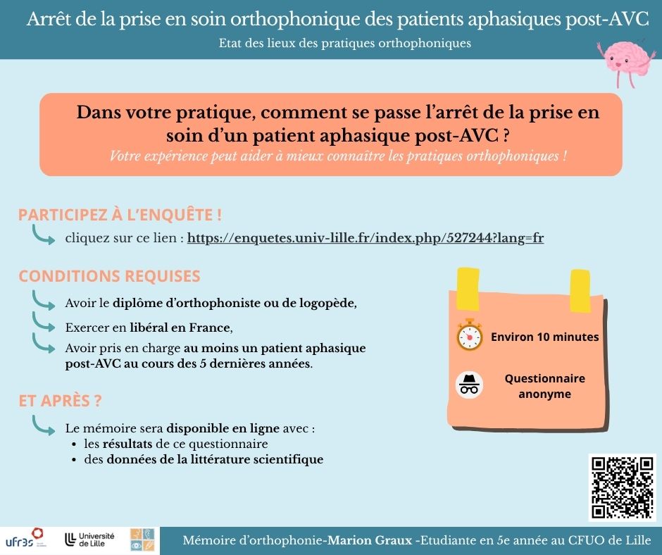 Dans le cadre de mon mémoire, encadré par Claire Beyls-Waroquier et Marie-Laure Simon, je mène une étude intitulée : « Arrêt de la prise en soin orthophonique des patients aphasiques post-AVC».
