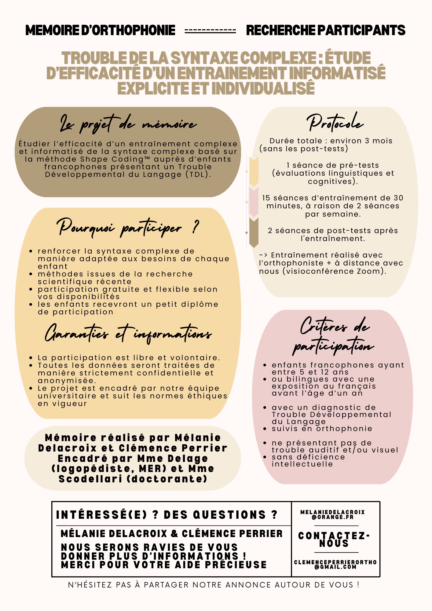 Nous recherchons des enfants francophones âgés de 5 à 12 ans, monolingues ou bilingues simultanés (exposés au français avant l’âge d’un an), présentant un déficit syntaxique diagnostiqué et suivis actuellement en orthophonie. Les enfants ne doivent pas présenter de trouble auditif.