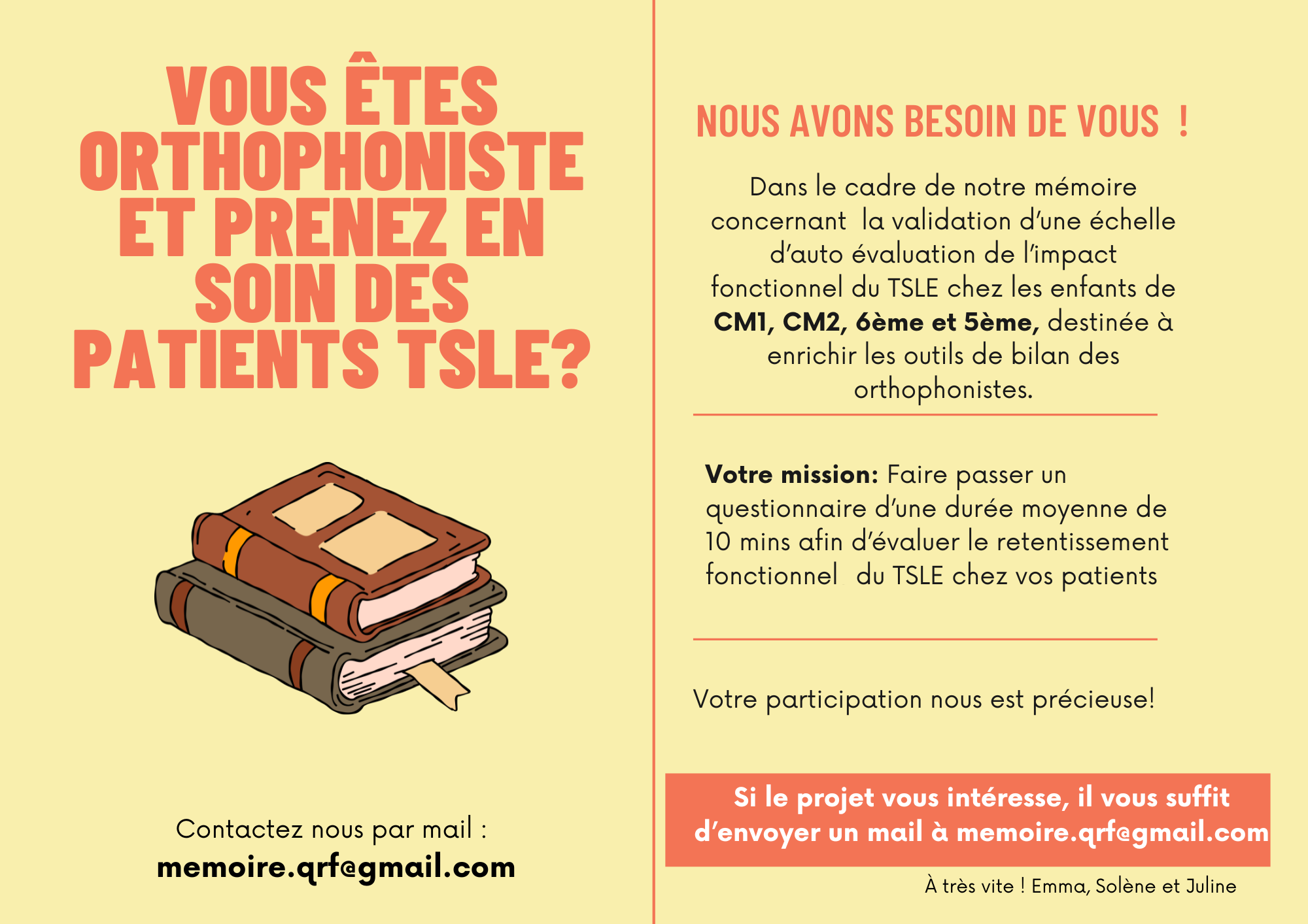 Mes collègues étudiantes et moi cherchons des orthophonistes prenant en soin des enfants avec un TSLE, scolarisés en CM1, CM2, 6e ou 5e, pour leur faire passer ce questionnaire (10–15 min de passation).